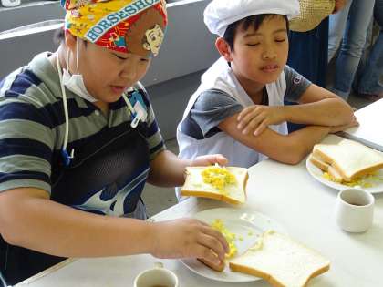 保護者の皆さんが近くで見守る中、包丁でウインナーを切ったり、フライパンでキャベツや卵をいためたりして、美味しそうな朝食のおかずが完成しました。