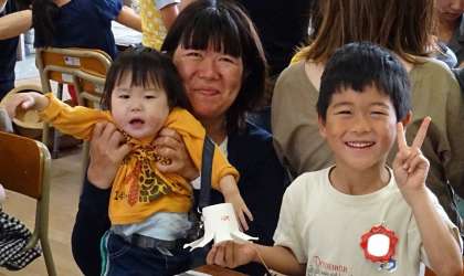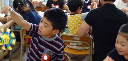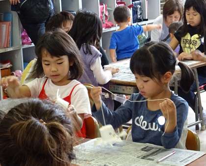 「3時間目は講堂に行って、作ったおもちゃで遊ぼう!」子どもたちは大喜びです。