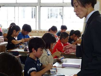 つるつるした大豆や小豆を、おはしを上手に使って、カップからカップへ移していきます。