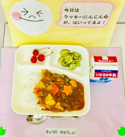 ハヤシライスには、給食室で作ったブラウンルウ(小麦粉とサラダ油を茶褐色になるまで炒めたもの)を使用しています。香ばしい香りとコクのある味付けで、子どもたちに大好評でした。