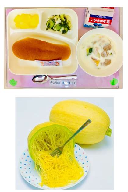 答えになった「そうめんかぼちゃ」の写真を見て「えー!なにそれ!」「中身がすごい!これ、本当にかぼちゃ?」など、驚きの声でいっぱいになりました。