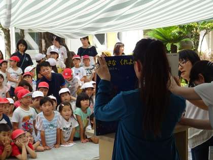 6月25日のお昼休み、加美東小学校の図書館ボランティアの皆さんによる絵本の「読み聞かせ会」が中庭で行なわれ、たくさんの子どもたちが集まりました。
