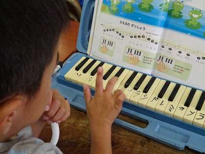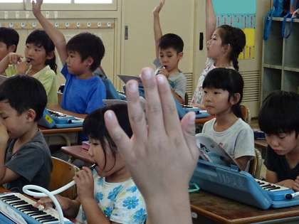 先生がオルガンで弾く音と同じ音を、子どもたちも自分の鍵盤ハーモニカで弾いてみます。