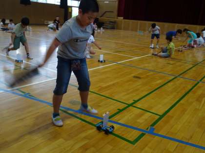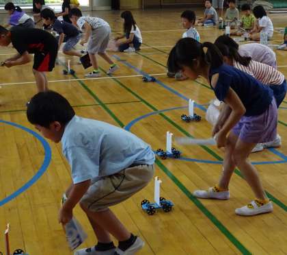 「めっちゃ速く進む!」実験結果に目を輝かせる子どもたちです。