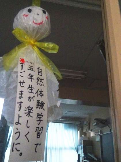 校舎の戸締り点検をしていると、ある教室の窓に優しいまなざしで空を見上げている“てるてる坊主さん”を見つけました。