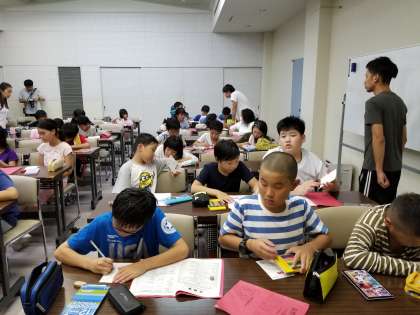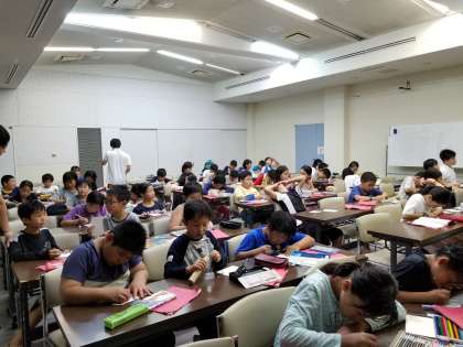 残念ながら夜のプログラムは雨天のため中止になりました。研修室で家族に宛てたハガキを書いています。
