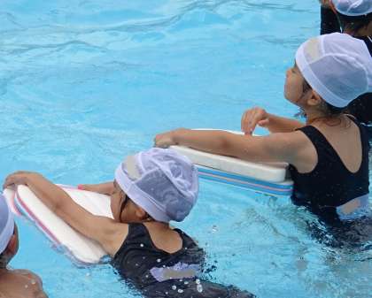 ビート版につかまって浮く練習をしています。