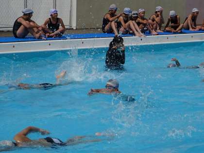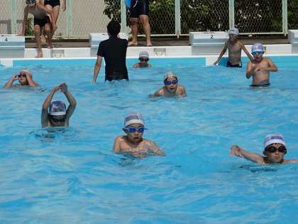 5年生は、水泳学習の授業で「リズム泳」に取り組んでいます。