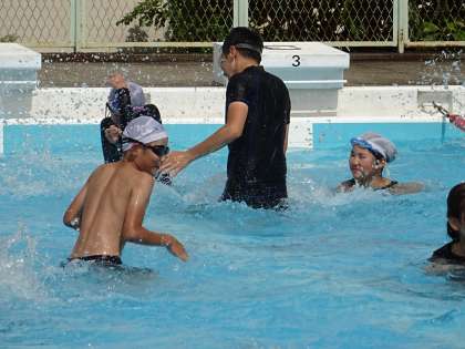 いっぱい泳いだ後は、自由練習の時間。先生と激しい水のぶっかけ合いが始まりました。