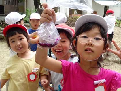 「うわあ、色水になった。紫色の水になったよ!」