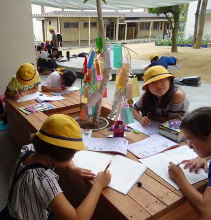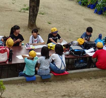 暑さにも負けず、たくさんの子どもたちが集まって勉強している放課後のアウトドア学習室です。