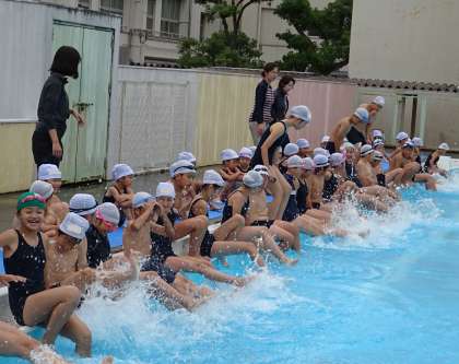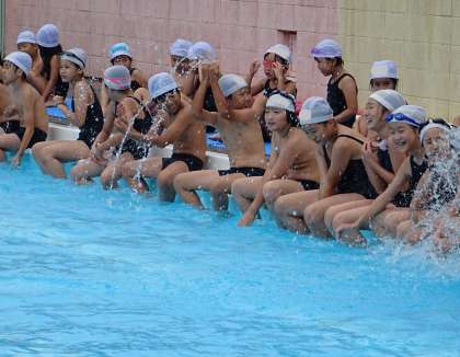 1年生の子どもたちは、6年生のバタ足を見てびっくり。
