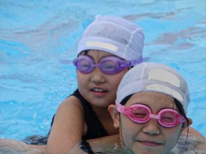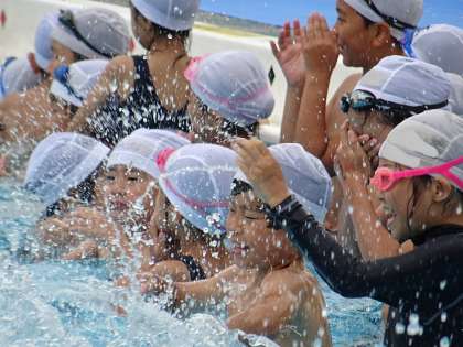 おんぶレース中、待っているペアはプールサイドで応援する予定でしたが、水の中にいる方が温かいようだったので、みんなプールの端につかまって応援をしました。