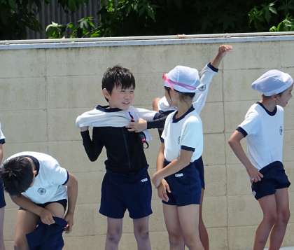 いつものように準備運動をしてシャワーを浴びた後、濡れた水着の上から体操服を着ます。