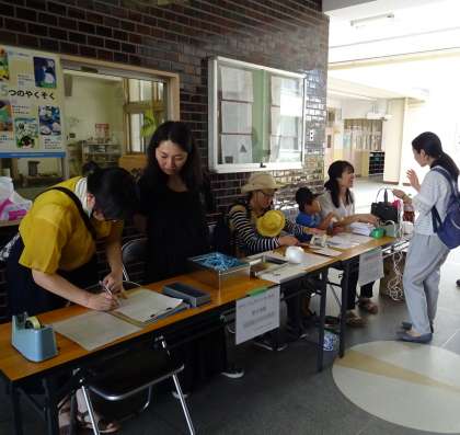 期末懇談会の期間中(7月12日〜7月18日)学校の玄関において、7月27日(土)に実施される「PTAサマーフェスティバル」の参加申し込み・前売りチケット販売が行なわれています。