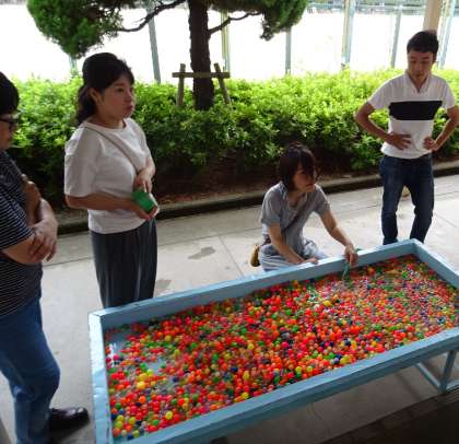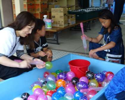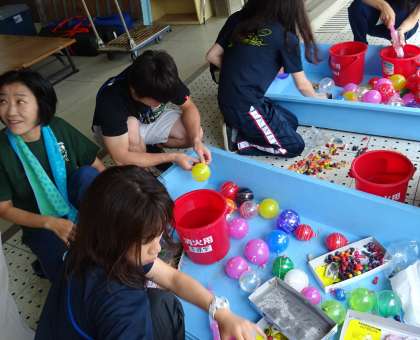 先生たちは、ヨーヨー釣りの風船を作りました。