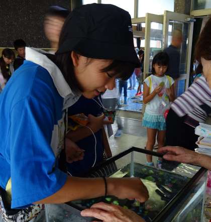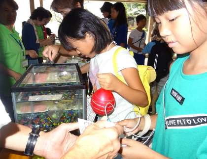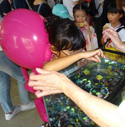 真上から水そうをのぞき込み、数センチ下にある器をめがけてコインを落とします。
