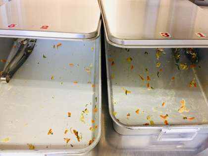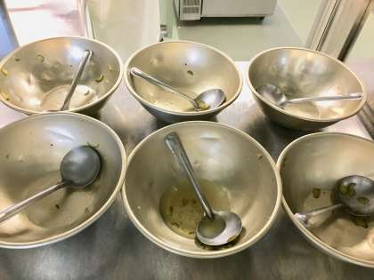 どのクラスの食缶も空っぽで、この暑さにも負けず、しっかりと食べてくれていました。