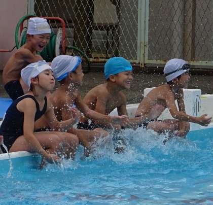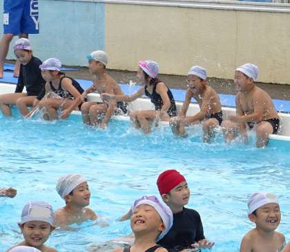 先生のハンドサインを確かめ、順番に従って体に水をかけていきます。