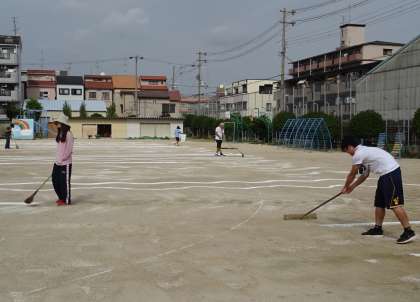 8月22日、教職員が協力して運動場整備「にがりまき」をしました。