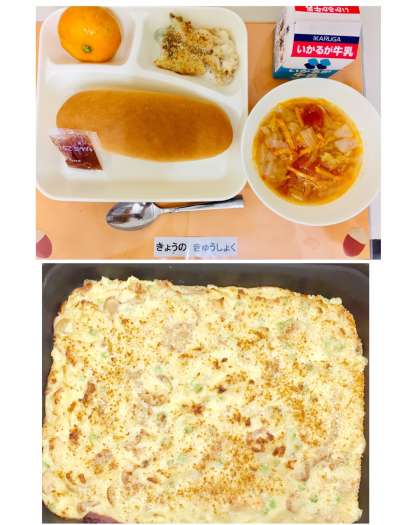 豆乳マカロニグラタンには、米粉で作られたマカロニとパン粉を使い、とろみ付けには上新粉を使用しています。