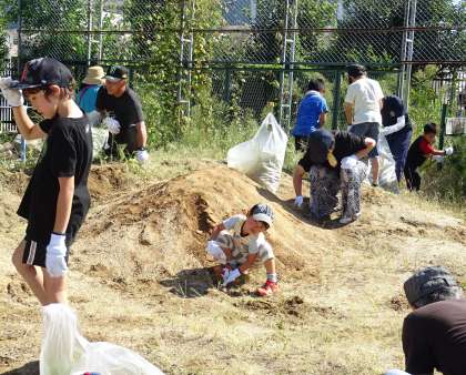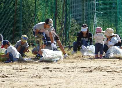 厳しい暑さの中、楽しくおしゃべりしながら次々と草を抜いていきます。