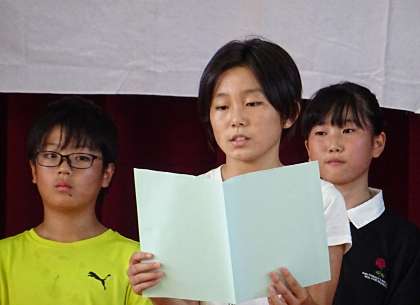 校長先生によるお祝いの言葉に続いてあいさつした3人の代表児童には、会場から大きな拍手が送られました。