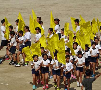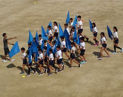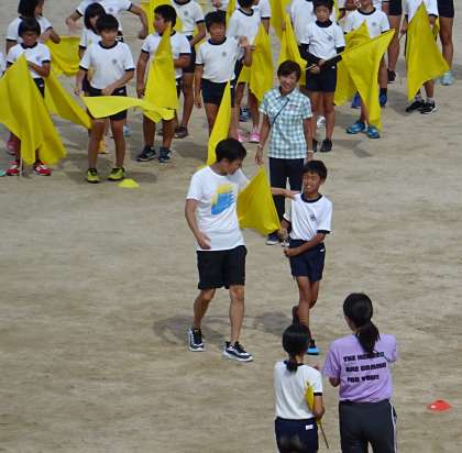 先生と一緒にポイントに向かって歩き、リズムと歩数を確かめます。