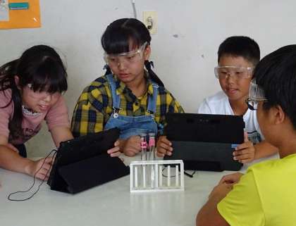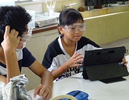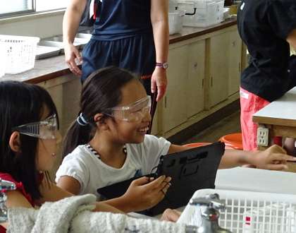 グループごとに自分たちが実験している様子をタブレット端末機で録画していました。