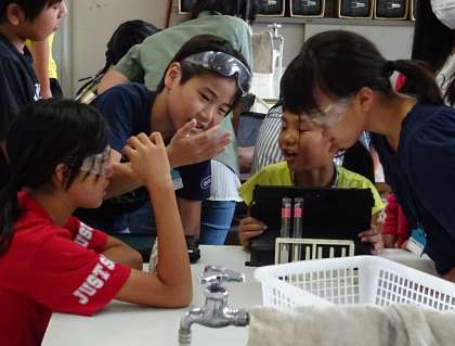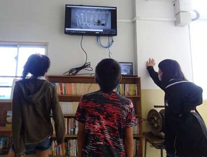 実験の様子に興味を持った他学年の子どもたちも、映像をじっと見ていました。