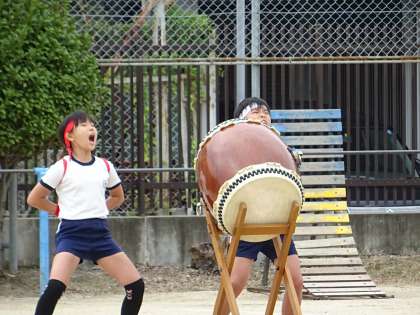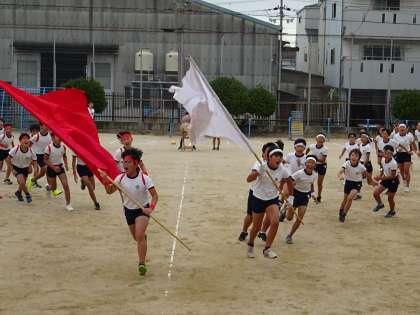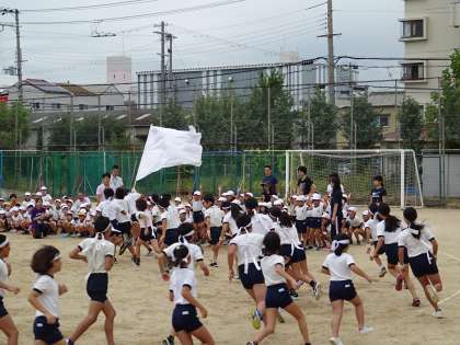応援団が赤組、白組の前を通る時、みんなでウエーブをして盛り上がります。