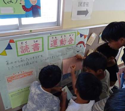 この時期、「読書運動会」の取り組みが行なわれ、学年ごとに読書した数を競っています。