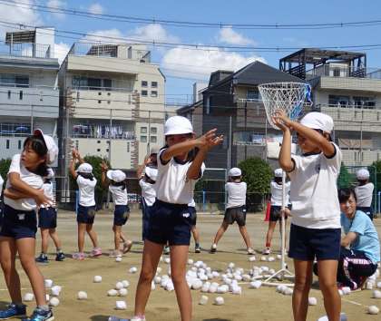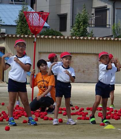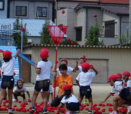 先生の合図で曲が変わると、激しい玉入れが始まります。