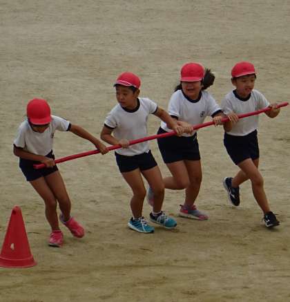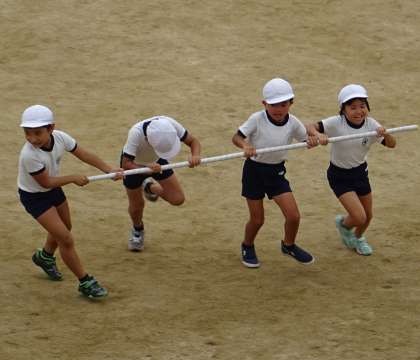 内側にいる子は小さく、外側にいる子は大きく回ることが、速くゴールするポイントです。