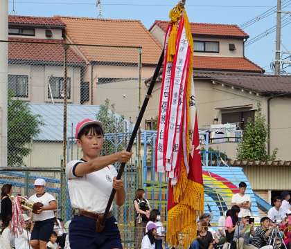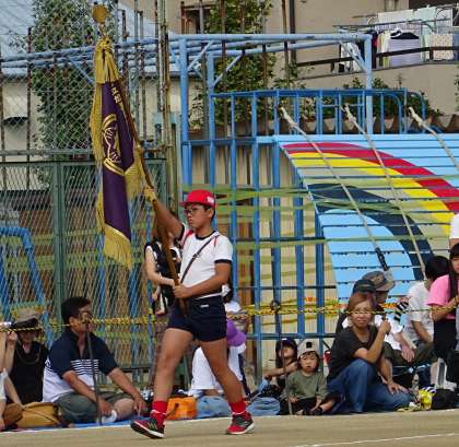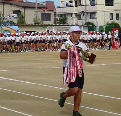 入場行進では、校旗を先頭に、昨年度優勝の赤組団長が優勝旗を、同じく準優勝の白組団長が準優勝トロフィーを持って堂々と入場しました。