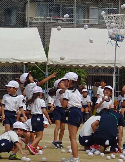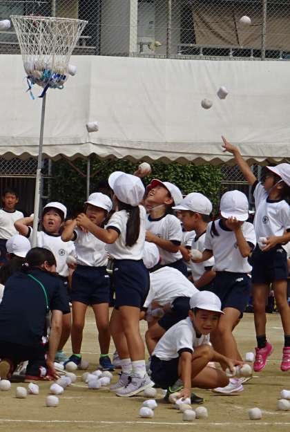 1年生による団体競技「ダンシング玉入れ」の様子です。