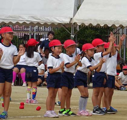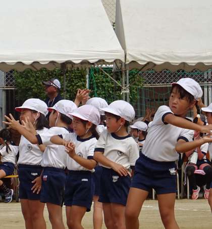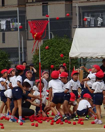 1年生による団体競技「ダンシング玉入れ」の様子です。