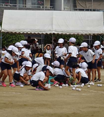 自分たちで玉を拾い集め、もとの箱に片付けます。