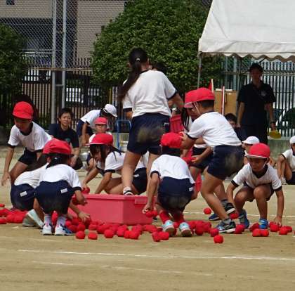 1年生による団体競技「ダンシング玉入れ」の様子です。