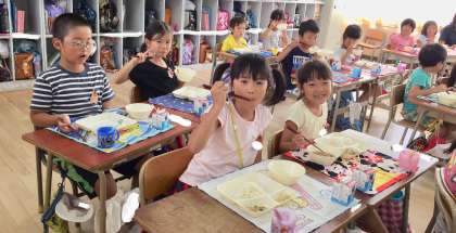 ソーキ汁は、たっぷりの削り節で出汁をとり、下茹でした豚ばら肉や切り昆布、大根、にんじん等を煮込み、みりん、塩、濃口醤油で味付けしています。出汁の風味や香りも良く、子どもたちに大好評でした。
