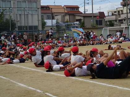 お約束のパフォーマンスに、赤組の子どもたちは喜んで寝ころびます。