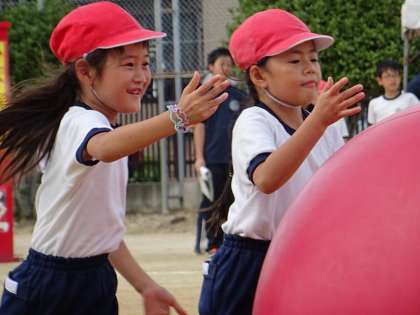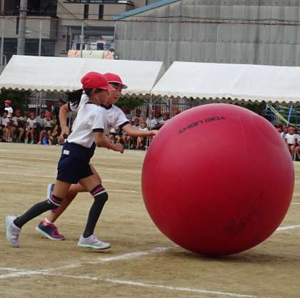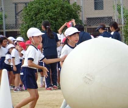 ゴール地点には赤・白のフープが置いてあり、そこに大玉をピタリと納めます。