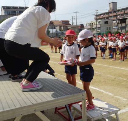 PTAの方から参加賞を受け取る1年生。