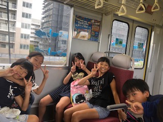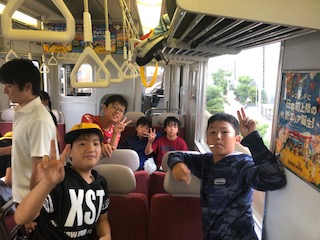 貸切電車に乗ることができました!電車内では、おやつを食べたり、トランプやUNOをして楽しんでます!