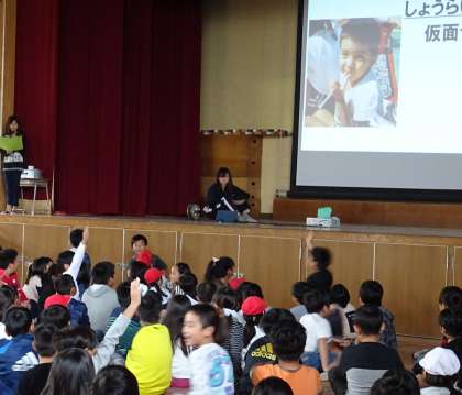 児童朝会では、集会委員会の子どもたちによる「この先生だあれ?」というクイズがありました。