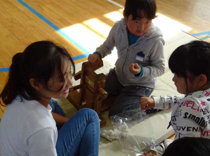 制作に必要な道具を使って、わたから糸をつむぎます。