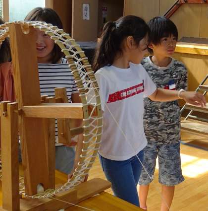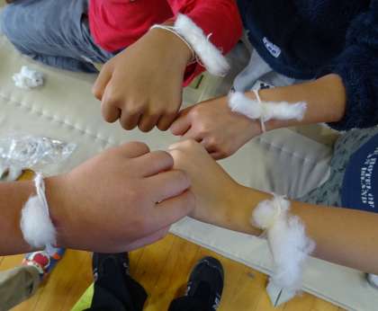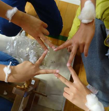 自分でつむいだ糸を、うでに巻いてもらった子どもたちは、とても喜んでいました。