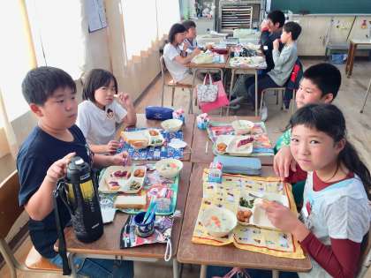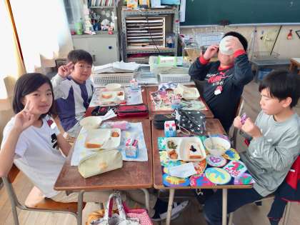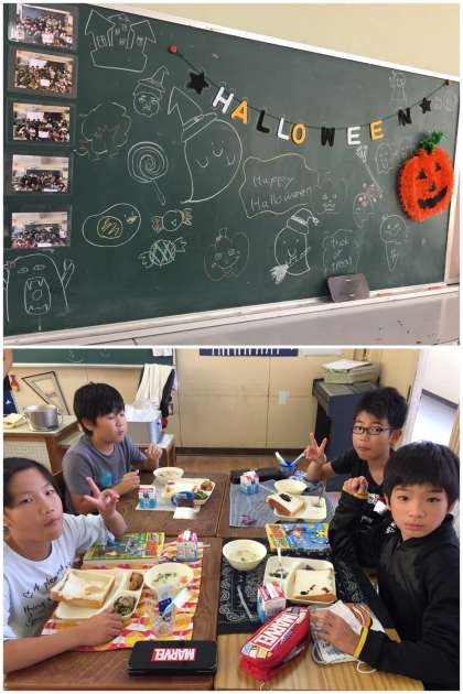 教室の後ろの黒板には、子どもたちの写真や描いた絵がいっぱい!