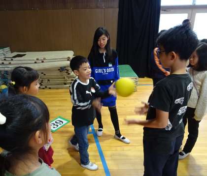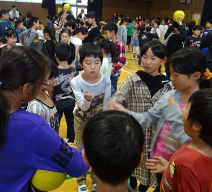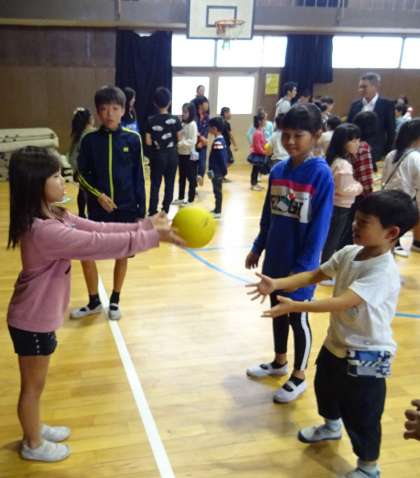 イギリスの遊び「水と木と土」が紹介されると、さっそくたてわり班のメンバーでやってみました。