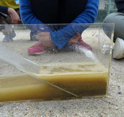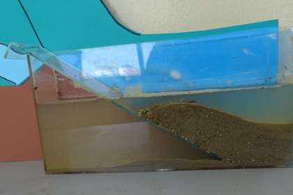 小さな実験装置ですが、重い小石から順番に沈んでいく様子を見ることができました。